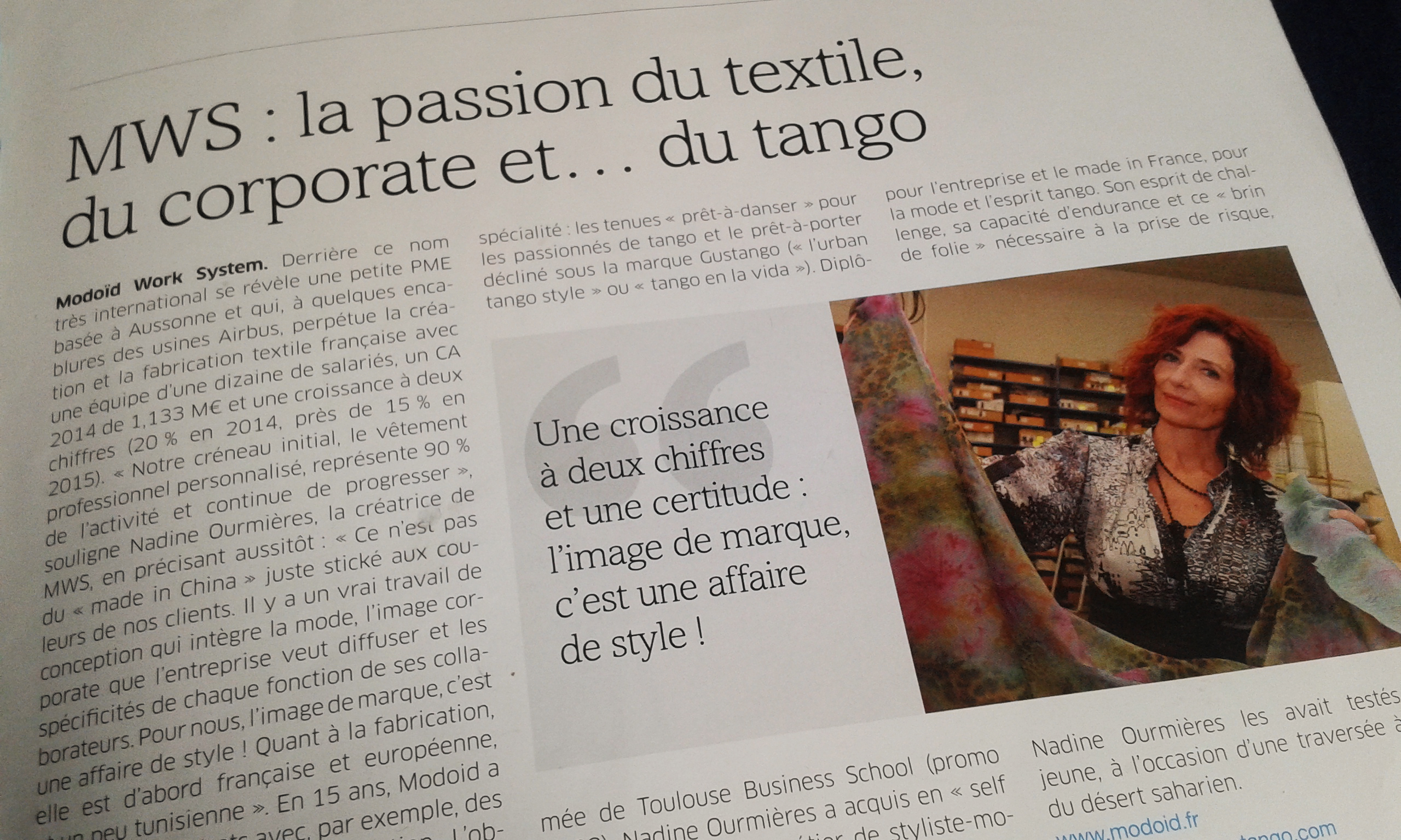 Modoïd Work System. Derrière ce nom très International se révèle une petite PME basée à Aussonne et qui, à quelques encablures des usines Airbus, perpétue la création et la fabrication textile française avec une équipe d’une dizaine de salariés, un CA 2014 de 1,133 M€ et une croissance à deux chiffres (20 % en 2014, près de 15 % en 2015). « Notre créneau initial, le vêtement professionnel personnalisé, représente 90 % de l’activité et continue de progresser ». Souligne Nadine Ourmières, la créatrice de MWS, en précisant aussitôt : « Ce n’est pas du « made in China » juste stické aux couleurs de nos clients. Il y a un vrai travail de conception qui intègre la mode, l’image corporate que l’entreprise veut diffuser et les spécificités de chaque fonction de ses collaborateurs. Pour nous, l’image de marque, c’est une affaire de style ! Quant à la fabrication, elle est d’abord française et européenne, et un peu tunisienne ».